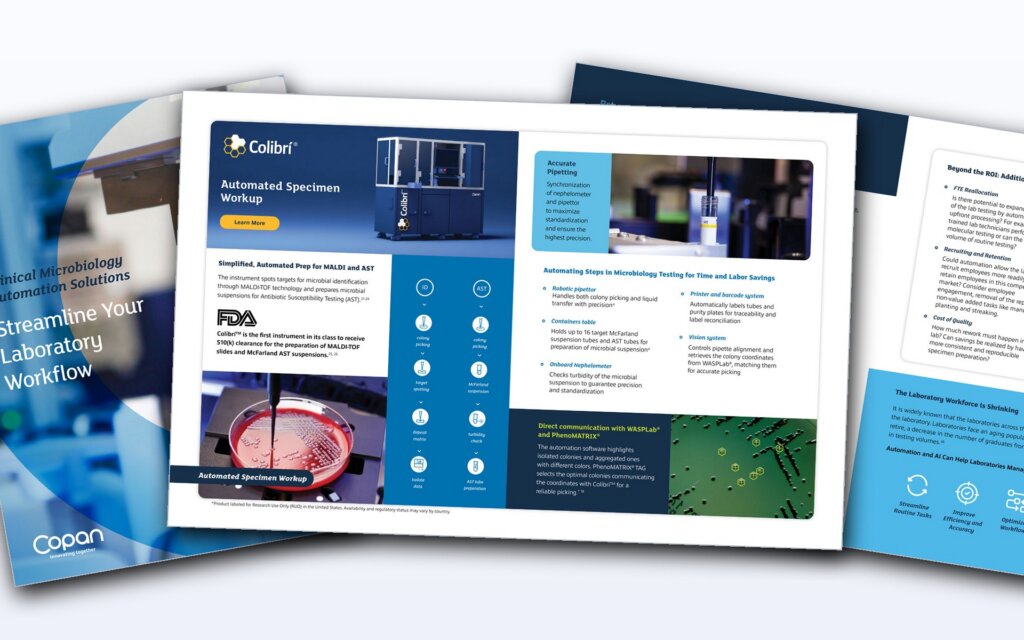 A look inside Copan’s Clinical Microbiology Automation Solutions brochure, with a focus on Colibrí™, the automated specimen workup instrument that prepares MALDI-TOF identification targets and McFarland suspensions for Antibiotic Susceptibility Testing (AST).